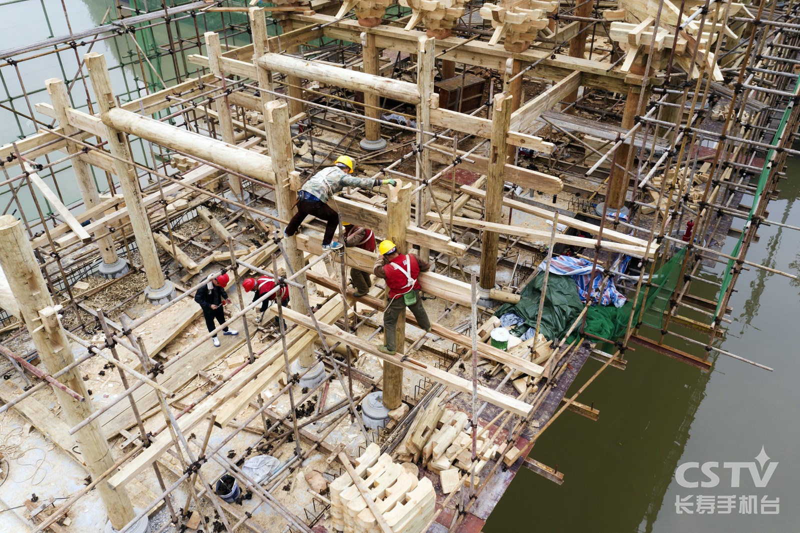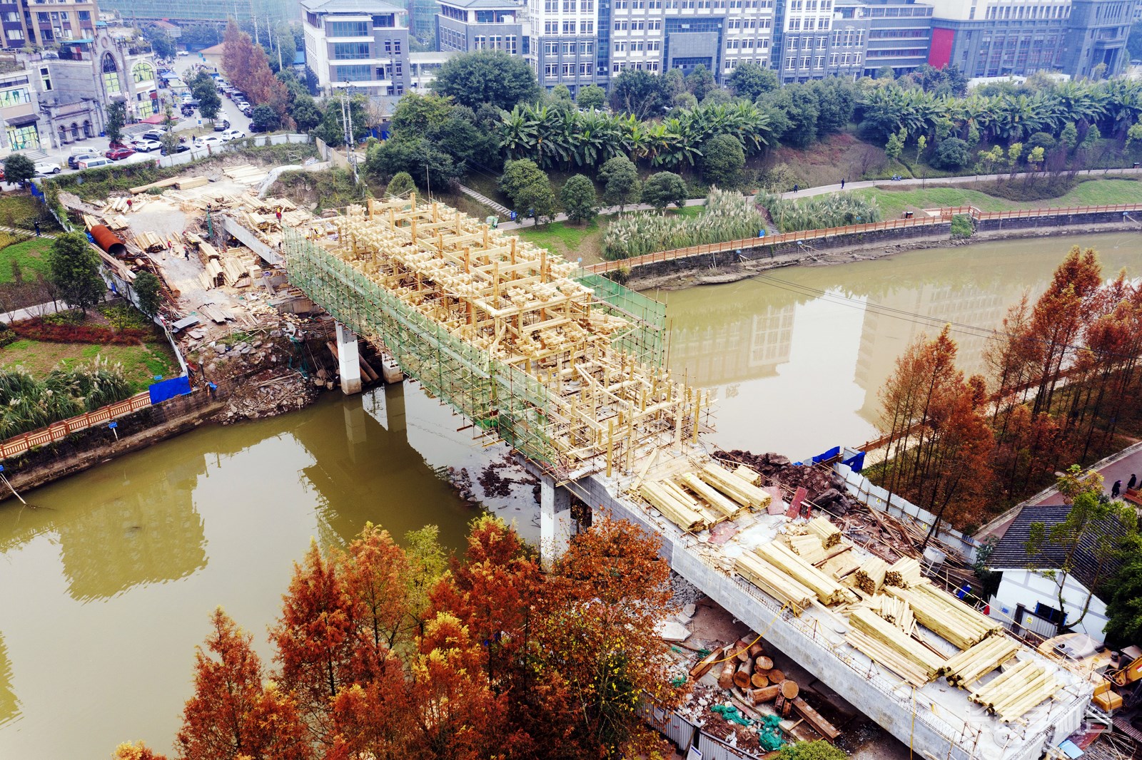 12月6日,桃源北一路跨河人行天桥工程施工现场,工人们正在加紧廊桥木构施工。经过一年的建设,大桥主体结构全部完成,整个工程预计明年6月竣工。